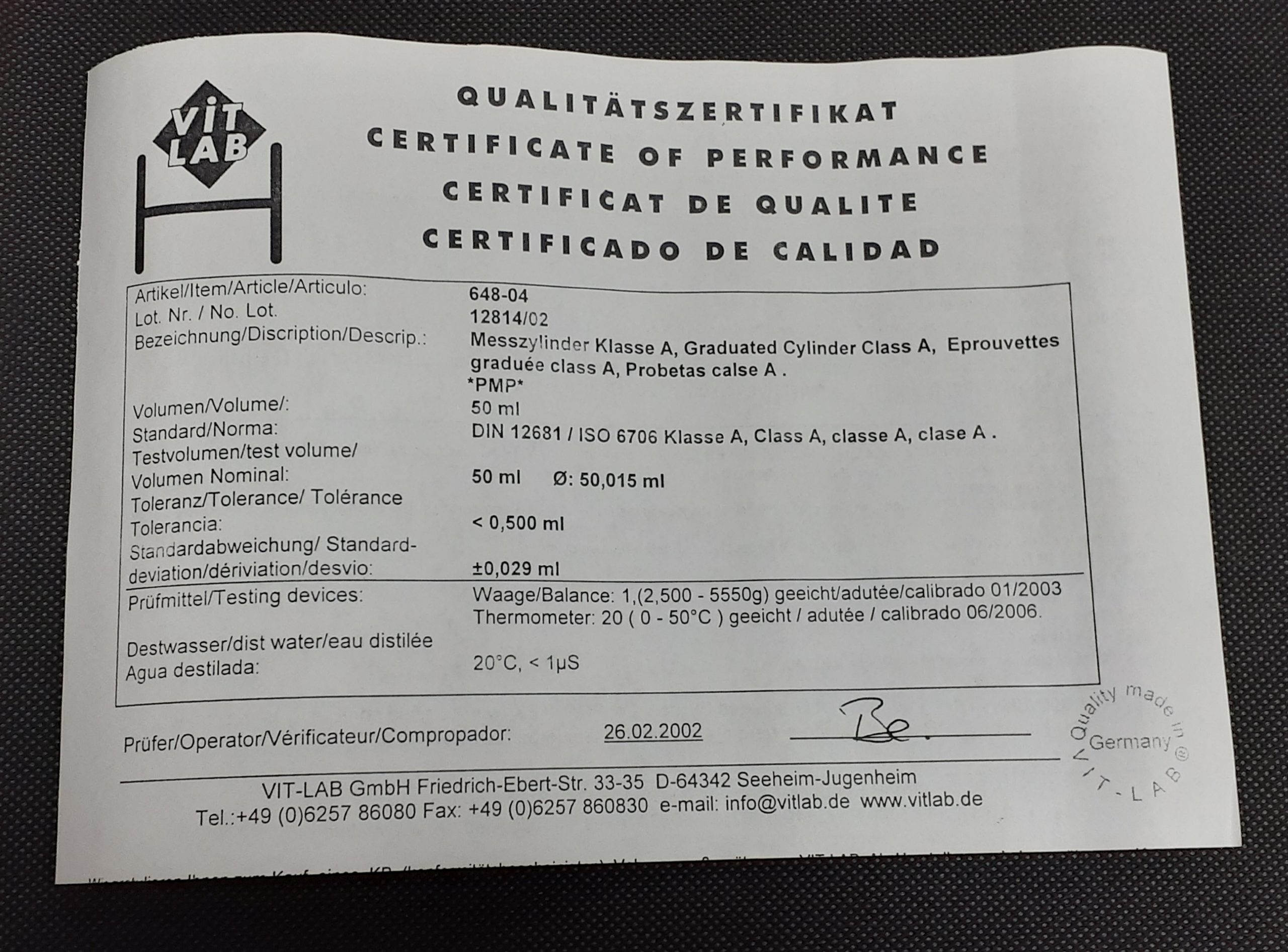 Class A: DIN 12681_ ISO 6706 with lot no. certificate.